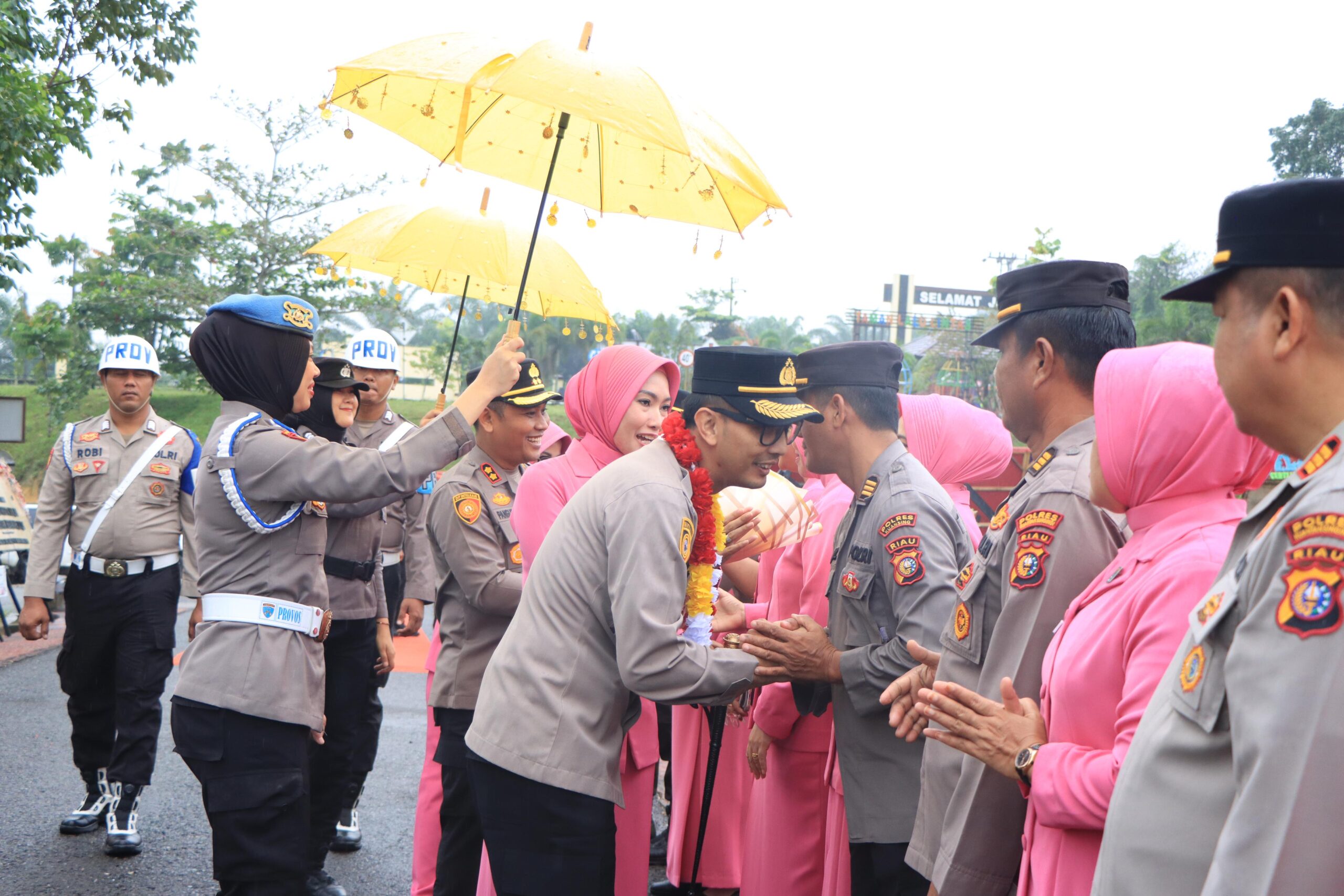 Acara dimulai dengan penyambutan Kapolres baru AKBP Angga F. Herlambang, S.I.K., S.H., yang tiba di Mapolres Kuansing. Prosesi penyambutan dilakukan secara adat melalui tarian persembahan, pengalungan bunga, dan tradisi Pedang Pora yang menambah kehangatan suasana.