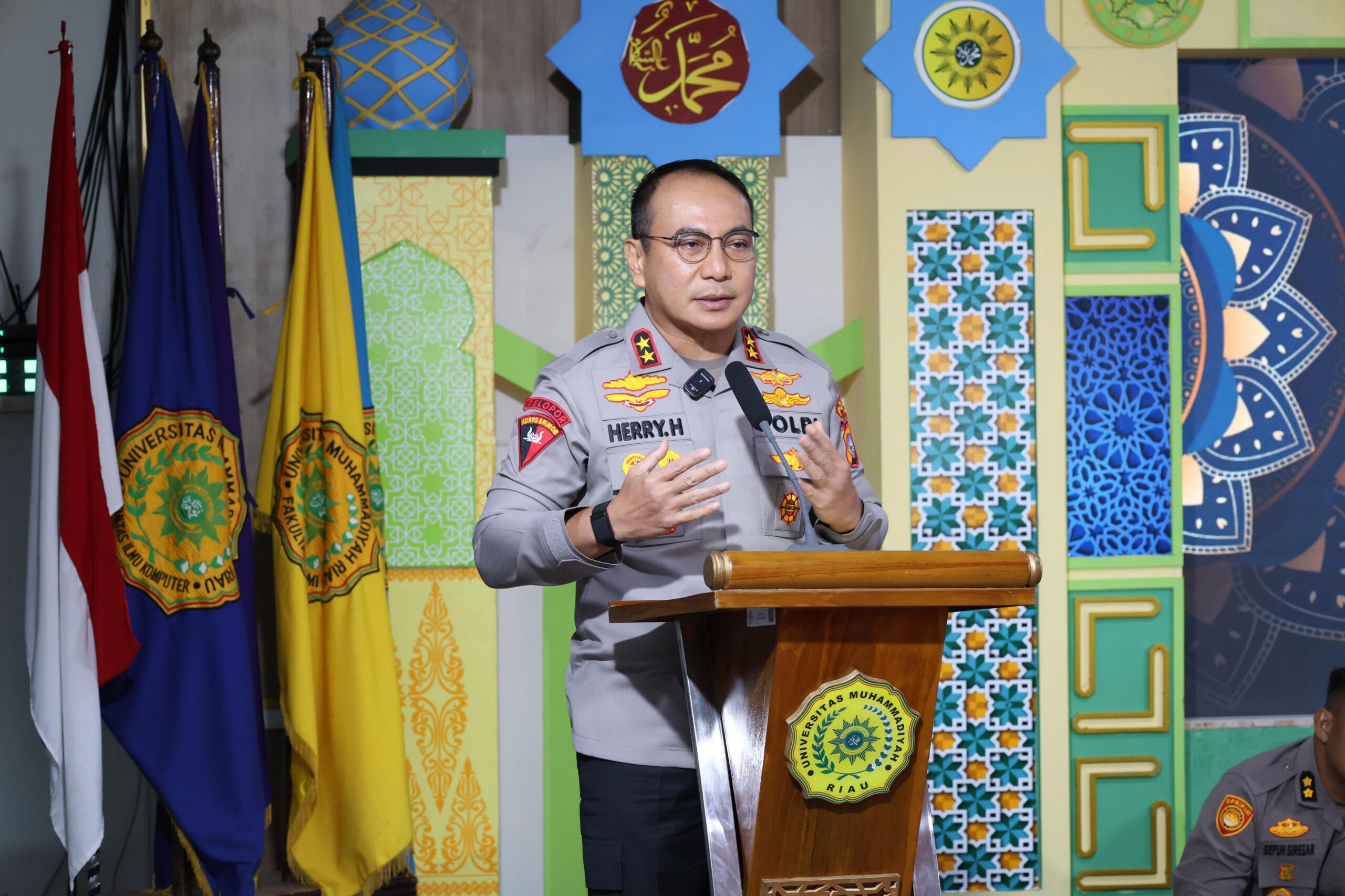 Kapolda Riau, Irjen Pol. Herry Hermawan, menyampaikan berbagai pesan strategis kepada mahasiswa, mulai dari tantangan global, pentingnya komunikasi, hingga kepedulian terhadap lingkungan. Beliau menekankan pentingnya mahasiswa menjadi agen perubahan yang berpikir kritis, menjunjung etika, dan berperan aktif dalam pelestarian alam.
