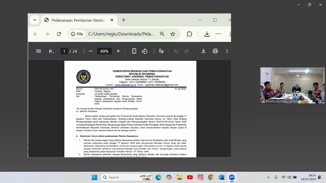 lingkupperistiwa.com, Pekanbaru – Lembaga Pemasyarakatan (Lapas) Kelas IIA Pekanbaru mengikuti kegiatan Sosialisasi Pelaksanaan Usulan Remisi dan Pengurangan Masa Pidana, yang dilaksanakan oleh Direktorat Jenderal Pemasyarakatan melalui Direktur Pembinaan Narapidana dan Anak Binaan, Yulius Sahruzah, pada Jum’at (18/07/2025).