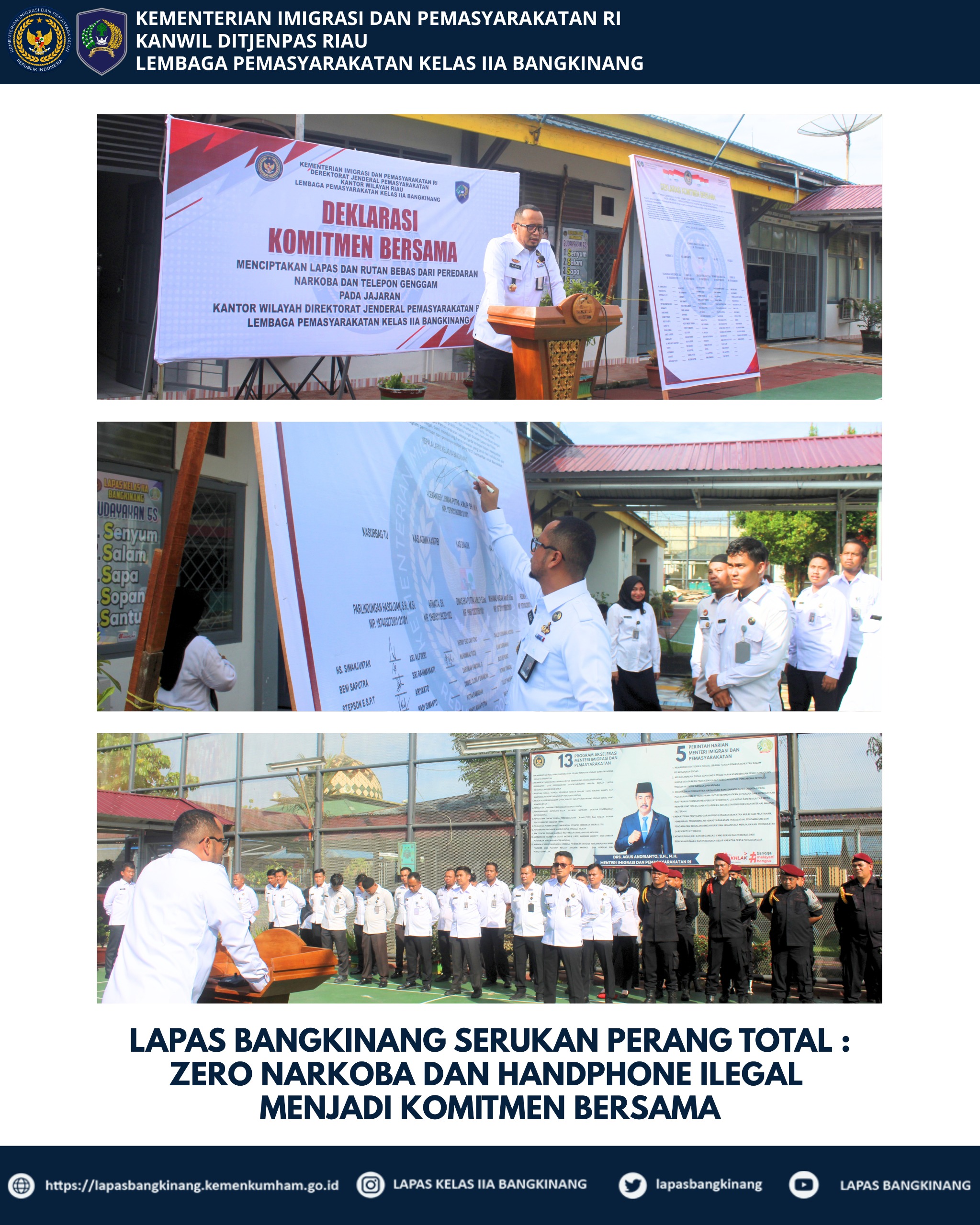 Kegiatan ini diikuti oleh seluruh jajaran pegawai dan jajaran pengamanan Lapas Kelas IIA Bangkinang. Dalam suasana penuh semangat, seluruh petugas menyatakan ikrar bersama untuk menjadikan Lapas Kelas IIA Bangkinang sebagai zona bebas dari penyalahgunaan narkoba dan penggunaan Handphone Ilegal.