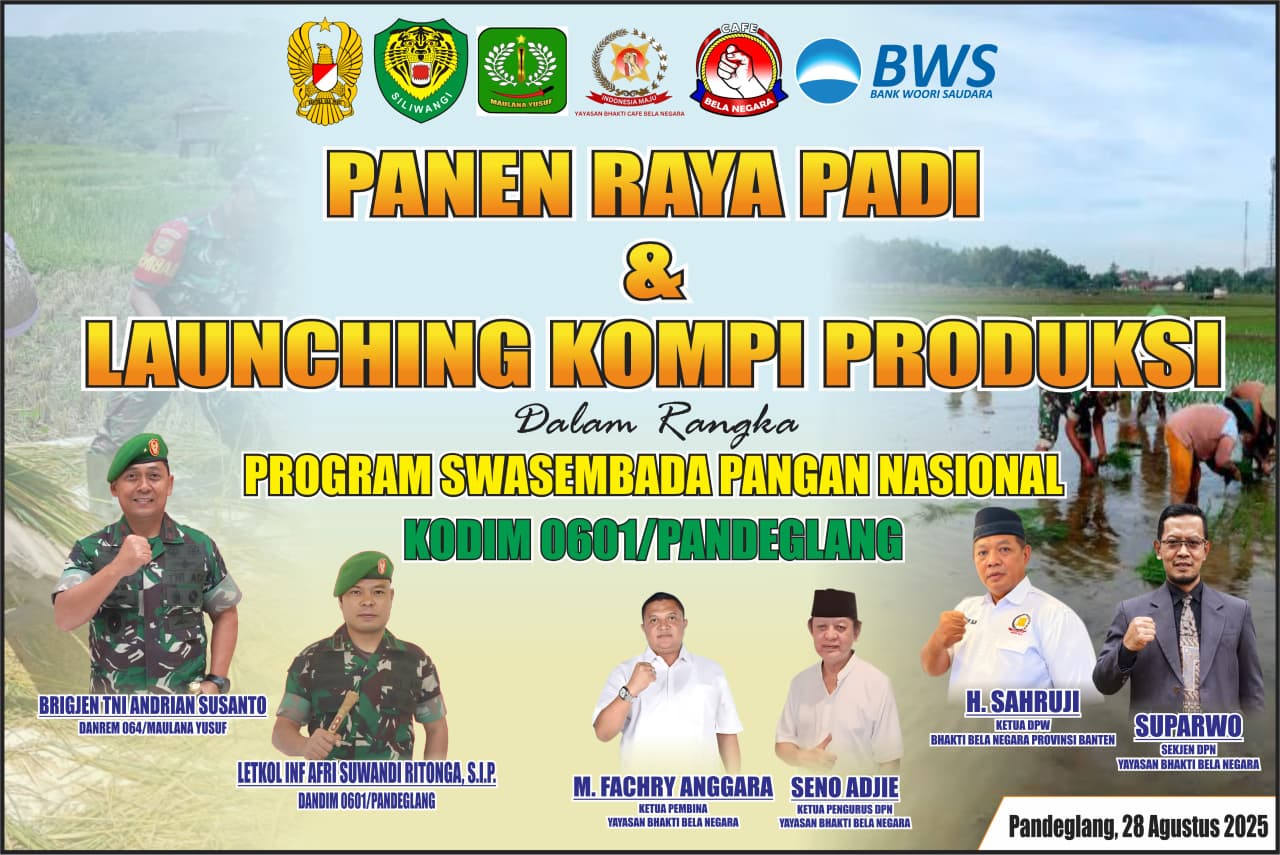 lingkupperistiwa.com, Pandeglang, –Dalam mendukung program swasembada pangan nasional Kodim 0601/Pandeglang melaksanakan kegiatan kegiatan Panen Raya Padi Bersama sekaligus Launching Kompi Produksi Kodim 0601/Pandeglang, bertempat di Kampung Mataram, Desa Carita, Kecamatan Carita, Kabupaten Pandeglang, Kamis (28/08/2025).