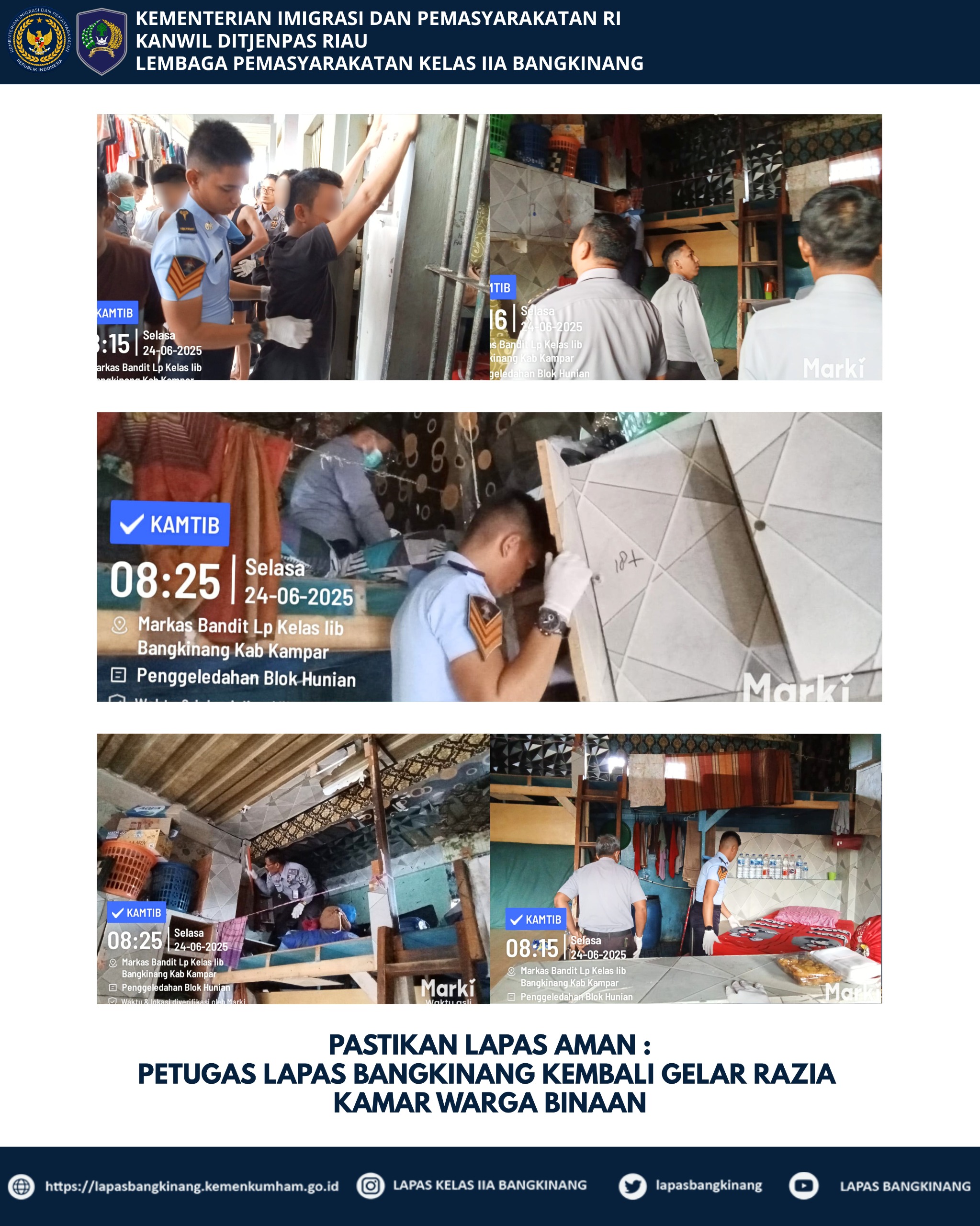 lingkupperistiwa.com, BANGKINANG- Dalam rangka menanggulangi potensi masuknya barang-barang terlarang ke dalam kamar hunian, Lembaga Pemasyarakatan (Lapas) Kelas IIA Bangkinang, Khusus nya tim Satopspatnal pada hari ini melaksanakan Razia di beberapa kamar hunian warga binaan,Pada Selasa (24/06/2025).