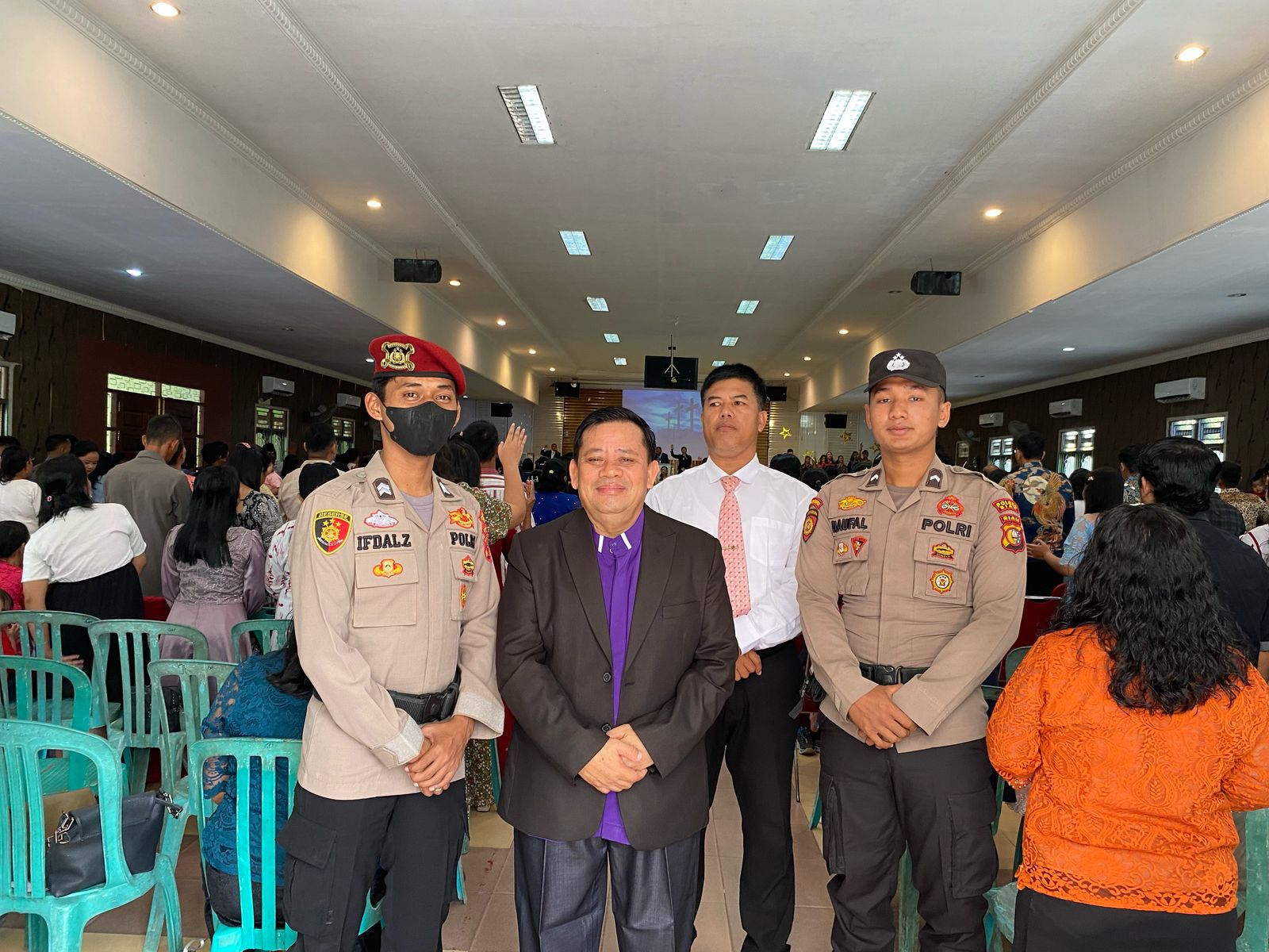 Sebanyak 10 personil ditempatkan dititik -titik pengamanan Gereja dalam rangka perayaan Paskah tahun 2025. Minggu (20/4/2025).