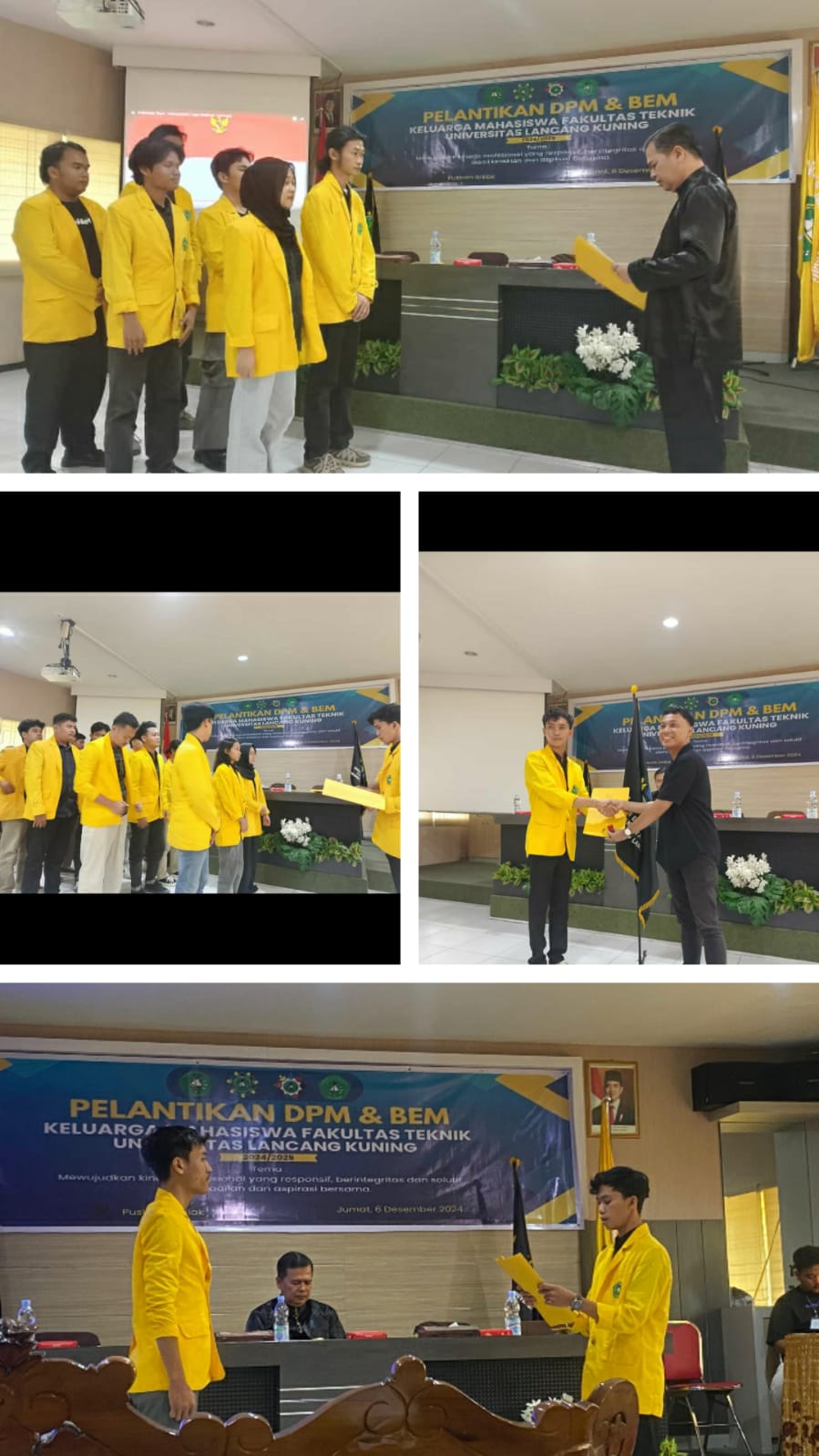 Kemudian yang dilantik oleh dekan fakultas Teknik adalah pengurus DPM-KM Fakultas Teknik UNILAK, dan DPM-KM Fakultas Teknik Melantik Gubernur Mahasiswa dengan Gubernur mahasiswa membacakan sumpah jabatan di hadapan Ketua Umum DPM-KM Fakultas Teknik UNILAK, yang selanjutnya Gubernur Mahasiswa Melantik dan membacakan teks sumpah jabatan lalu di ikuti oleh Wakil Gubernur Mahasiswa baru dilanjutkan melantik dan membacakan sumpah jabatan dan di ikuti oleh pengurus baru BEM-KM Fakultas Teknik UNILAK periode tahun 2024/2025, masing-masing terdiri atas Sekretaris jendral, Bendahara dan diikuti anggota masing-masing bidang. Kegiatan ini bertempat di ruang rapat lantai 3 rektorat Universitas Lancang Kuning.