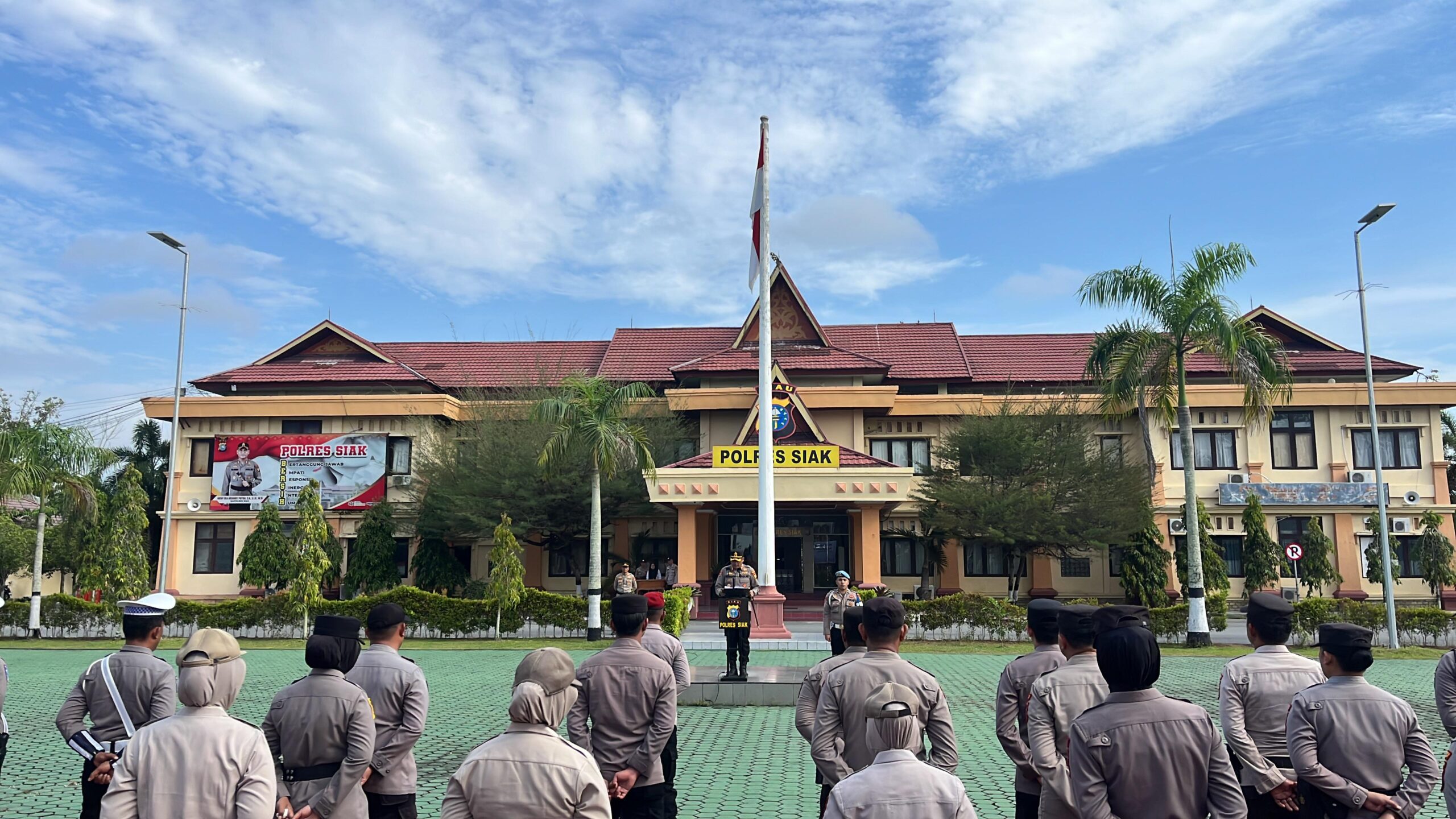 Upacara berlangsung dengan susunan acara resmi, dimulai pukul 08.00 WIB dan diikuti oleh para pejabat utama Polres, para Kapolsek jajaran, perwira, personel, serta ASN Polres Siak. Bertindak sebagai Perwira Upacara yaitu Kapolsek Sungai Apit AKP Rinaldi Parlindungan S, S.H., sementara IPDA Arnes Renaldo S. dipercaya sebagai Komandan Upacara.