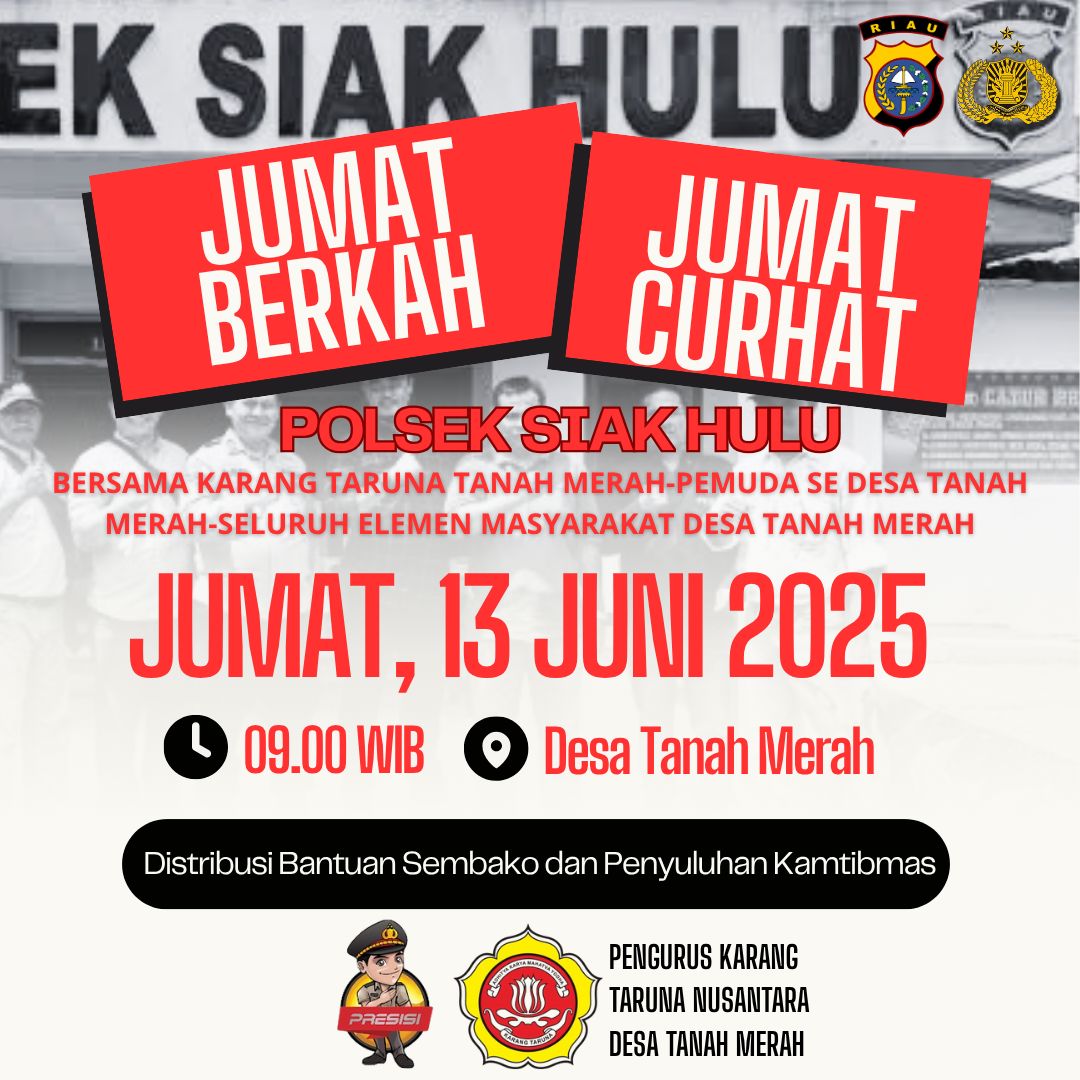 lingkupperistiwa.com, Siak Hulu, 13 Juni 2025 – Dalam semangat kebersamaan dan kepedulian sosial, Polsek Siak Hulu bersama Karang Taruna Desa Tanah Merah dan seluruh elemen masyarakat menggelar program pembagian sembako kepada warga kurang mampu di Desa Tanah Merah, Kecamatan Siak Hulu. Kegiatan ini merupakan bagian dari program rutin bertajuk “Jumat Berkah dan Jumat Curhat” yang dilaksanakan setiap hari Jumat.