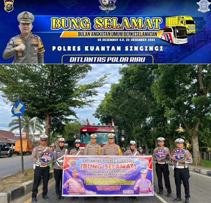 lingkupperistiwa.com, KUANTANSINGINGI,- Satuan Lalu Lintas (Satlantas) Polres Kuantan Singingi menggelar kegiatan sosialisasi bertajuk “Bung Selamat” (Bulan Angkutan Umum Berkeselamatan) di wilayah hukum Polres Kuansing. Kegiatan ini dilakukan pada Kamis pagi di Jalan Proklamasi (Traffic Light), Kecamatan Kuantan Tengah, Kabupaten Kuansing pada Kamis (12/12/2024).