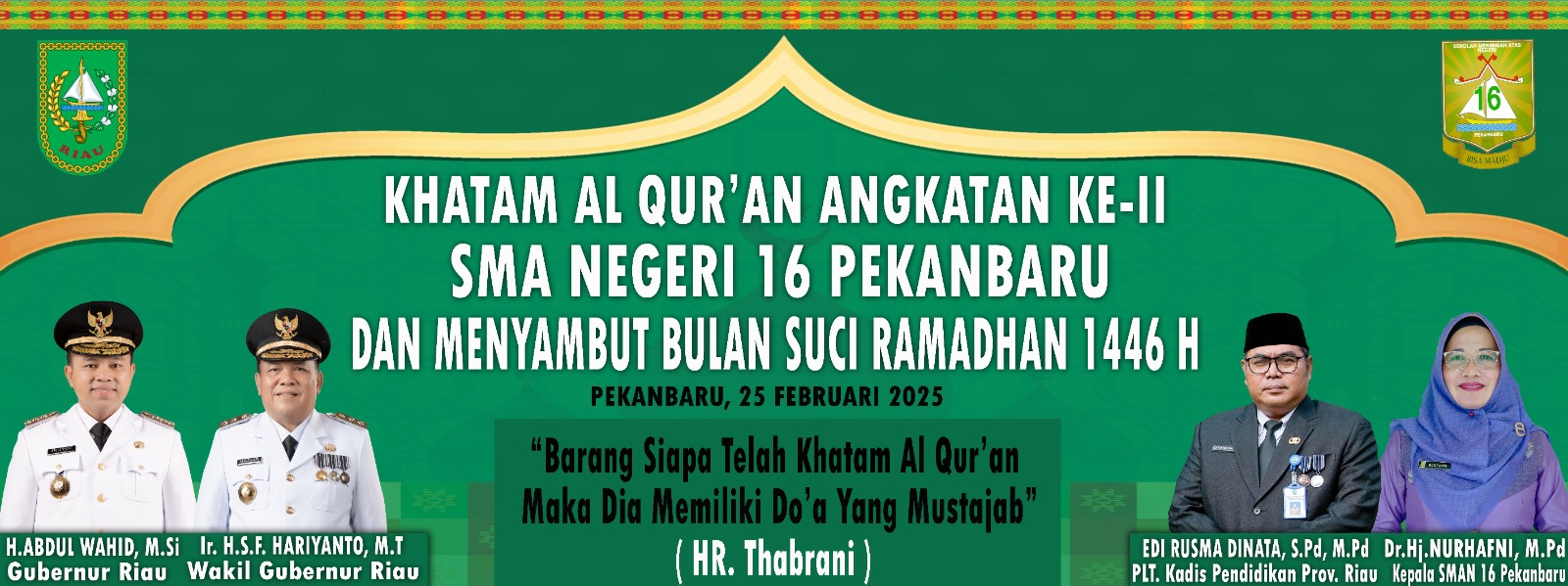 Kepala Sekolah SMAN 16 Pekanbaru Dr.Hj.Nurhafni,M.Pd mengatakan, kegiatan Khatam Al-Quran ini adalah angkatan ke 2 bagi siswa kelas 12 . Kegiatan ini merupakan program sekolah dalam peningkatan ketaqwaan dan pendidikan karakter yang kita lakukan disekolah dengan membaca Al-Qur’an diawal pembelajaran 10 sampai 15 menit setiap harinya , “Untuk kelas 12 kita laksanakan Khatam Akbar. Kita berharap peserta didik menjadikan Alquraan sebagai pedoman hidup dan siswa yang cinta Al-Quran ” ujar nya, sehingga peserta didik kita, ketika tamat sekolah dari SMAN 16 Pekanbaru nantinya dapat memberikan contoh teladan di masyarakat, keluarga bahkan di Perguruan tinggi juga di dunia pekerjaan ” ucapnya lagi