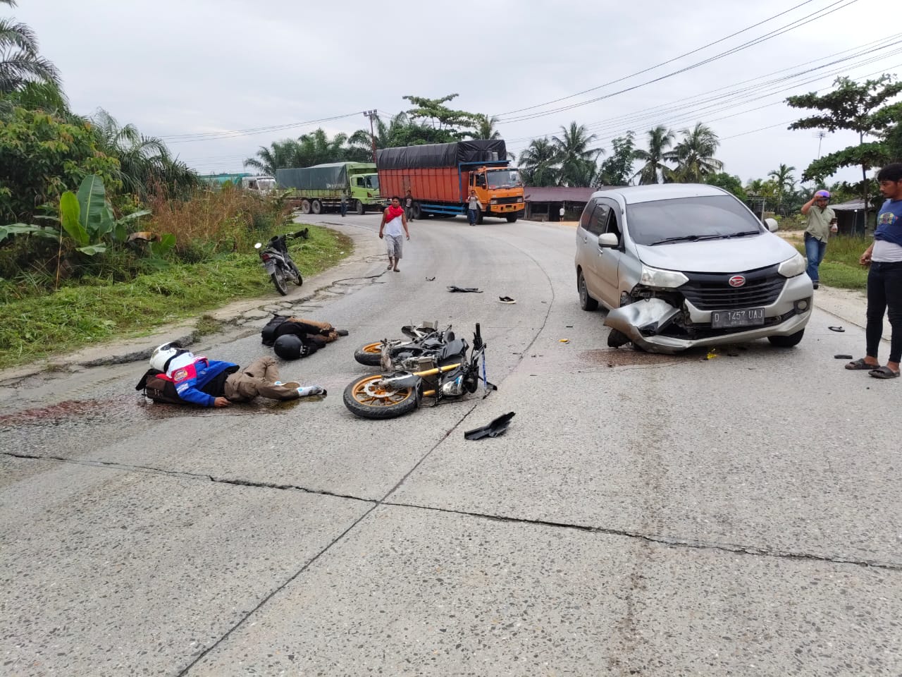 Sepeda yang di kendarai oleh dua orang laki-laki. Pengendara sepeda motor tersebut mengalami patah kaki dan dada terhempas.