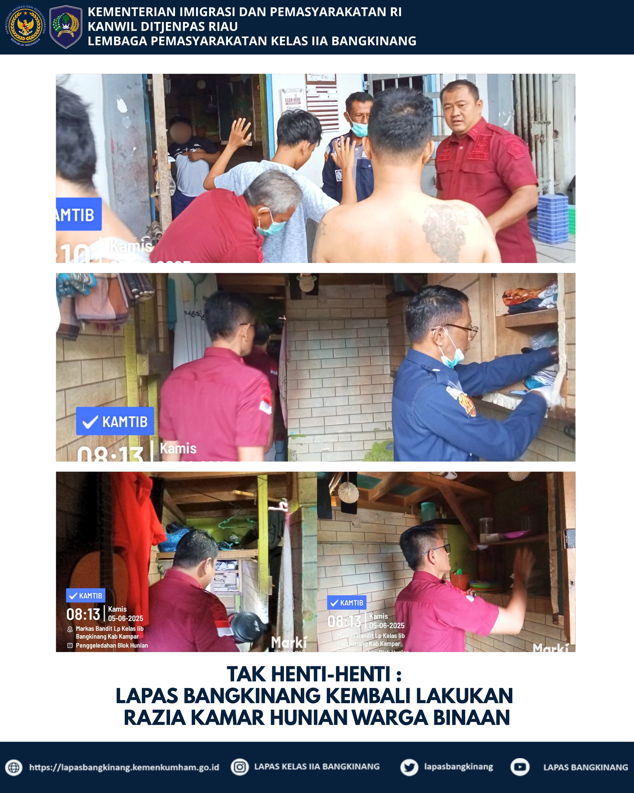 Kepala Lembaga Pemasyarakatan (Kalapas) Kelas IIA Bangkinang, Alexander Lisman Putra selalu menyampaikan kepada seluruh jajarannya agar dalam pelaksanaan tugas untuk dilaksanakan dengan penuh semangat dan tanggung jawab serta untuk selalu melaporkan kejadian yang terjadi di dalam Lapas secara berjenjang dan kegiatan Razia ini juga merupakan bentuk tindaklanjut Lapas Bangkinang dalam menindaklanjuti Arahan 13 (tiga belas) Program Akselerasi Menteri Imigrasi dan Pemasyarakatan, Bapak Agus Andrianto khususnya pada poin 1 (satu) yakni Memberantas Peredaran Narkoba dan Pelaku Penipuan dengan berbagai modus di Lapas dan Rutan.