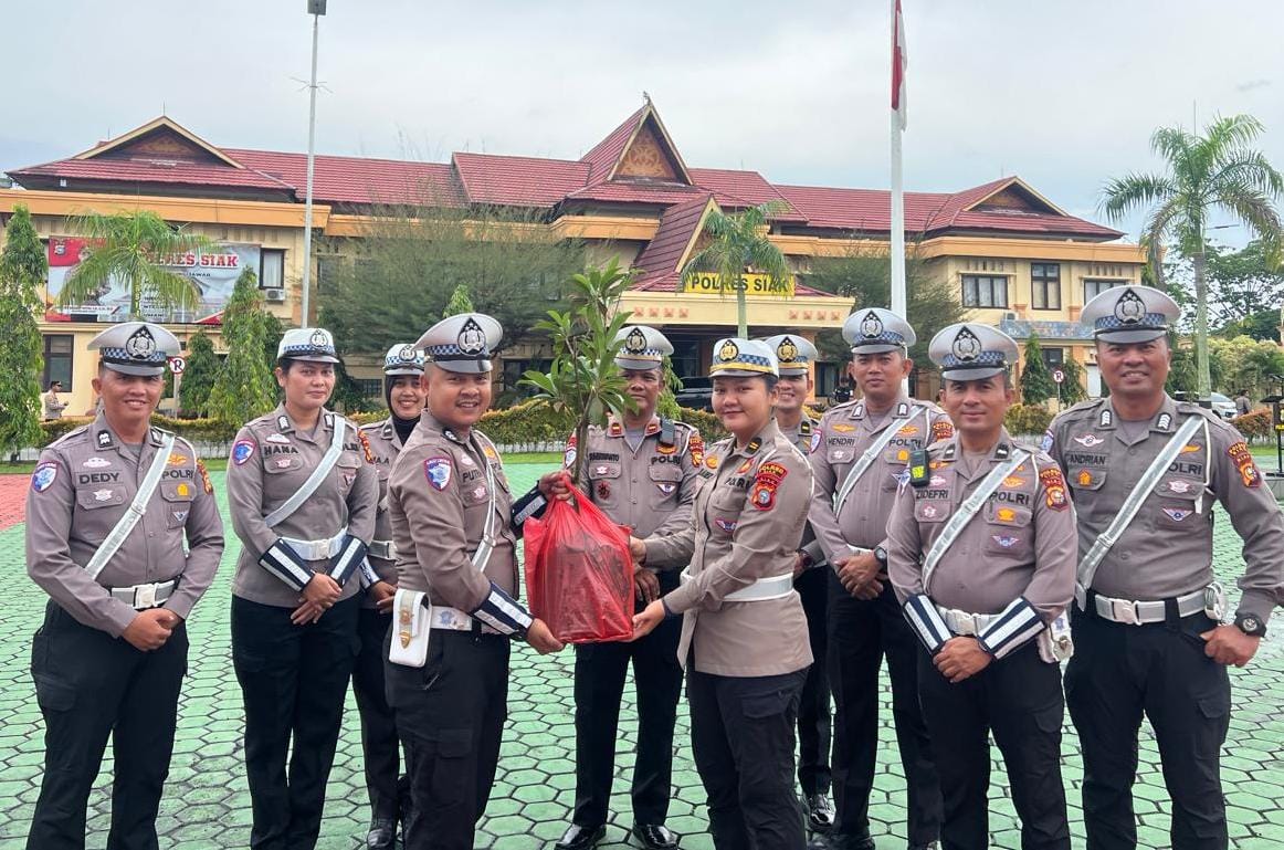 Kegiatan berlangsung di halaman Mapolres Siak sekitar pukul 08.00 WIB, dengan suasana hangat dan penuh keakraban. Penyerahan bibit pohon secara simbolis dilakukan oleh Kanit Regident Satlantas Polres Siak, Iptu Eunike Sabrina Damanik, S.Tr.K., M.H., kepada Brigadir Muhammad Saputra, S.H., personel Samsat Lubuk Dalam yang tengah merayakan hari ulang tahunnya.