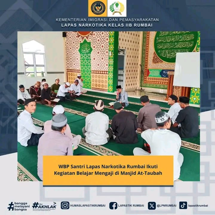 lingkupperistiwa.com, Pekanbaru – Warga Binaan Pemasyarakatan (WBP) yang tergabung dalam santri Lapas Narkotika Kelas IIB Rumbai mengikuti kegiatan belajar mengaji di Masjid At-Taubah (9/3/2026). Kegiatan ini merupakan bagian dari program pembinaan kerohanian yang rutin dilaksanakan bagi WBP.
